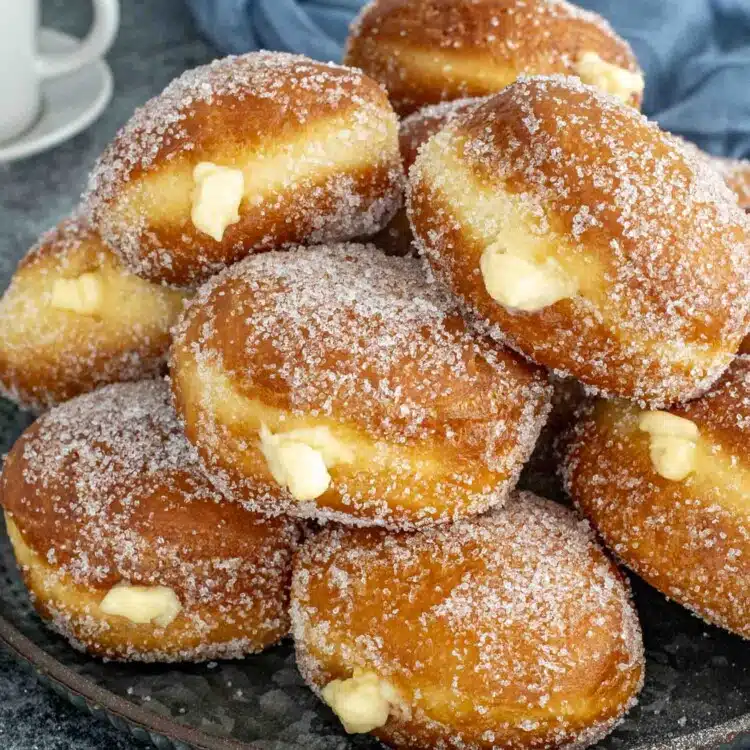 freshly made danish butter cookies dusted with powdered sugar on a plate.
