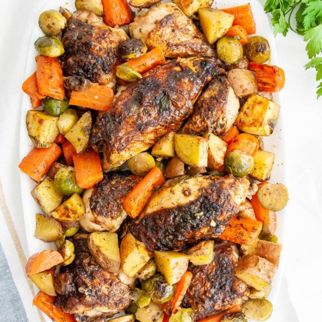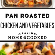 Remember, chicken should only be reheated once after it’s cooked and the best way to do that, in my opinion, is to pop it back in the oven until heated through. Put your left over chicken and vegetables in an oven-safe dish, cover it, and roast in the oven for 25 minutes at 350° or if your prefer, you can just pop it on a plate and reheat it in the microwave for 2-5 minutes.