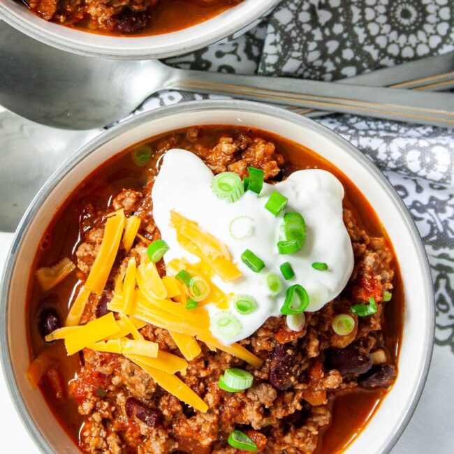 - Serve the best chili: Ladle into bowls and top with shredded cheddar cheese, green onions, and sour cream!