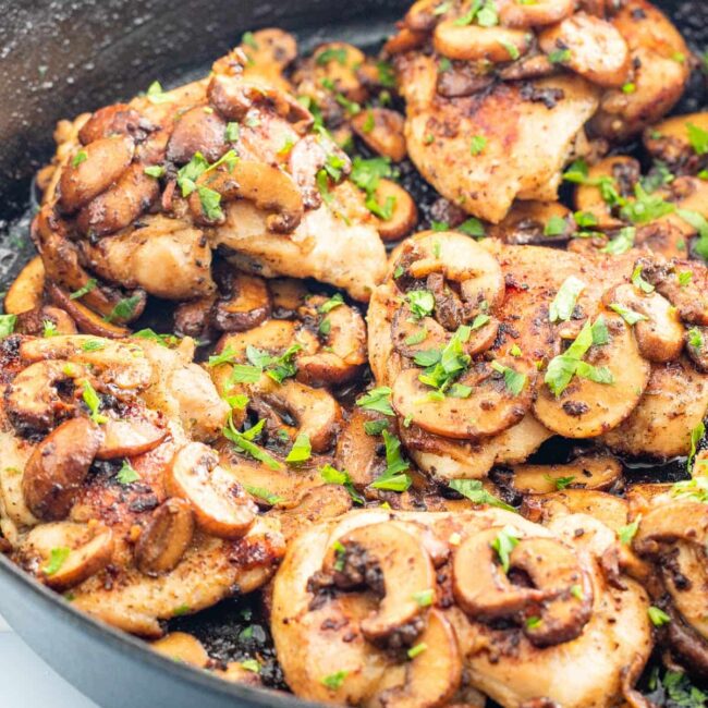 - Finish and Serve – Return the chicken back to the skillet. Top each chicken thigh with mushrooms, garnish with fresh parsley. Serve immediately.