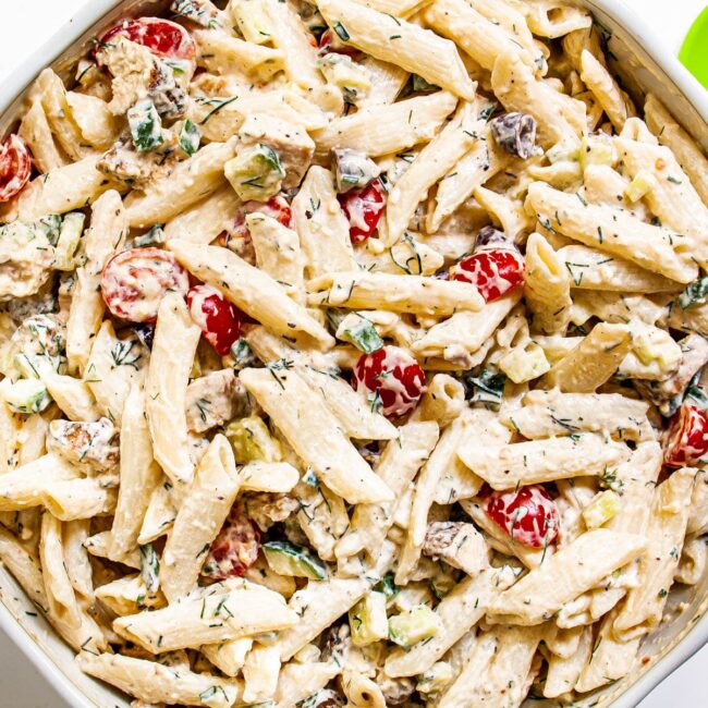 - Combine the dish: Add the cooked pasta, cheese sauce, chicken, cherry tomatoes, kalamata olives, cucumber, and dill to a large bowl and toss everything until well combined.