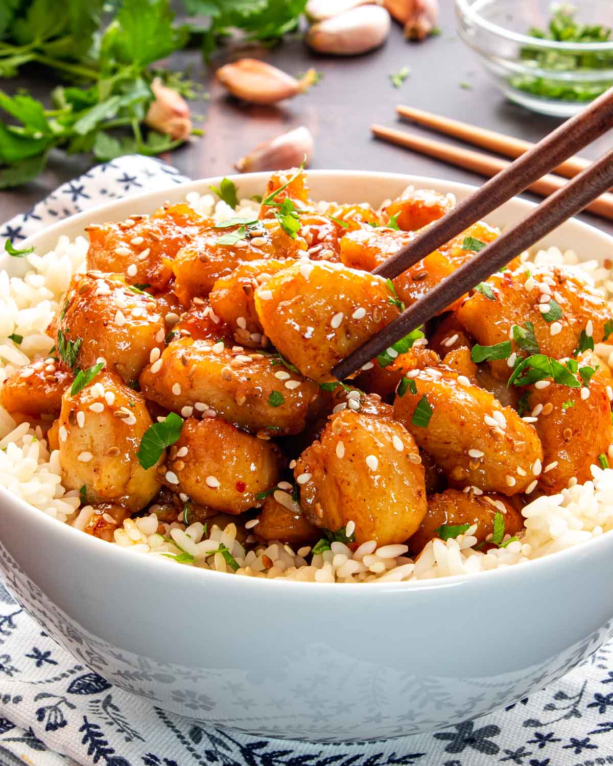 - Garnish and serve. Garnish with fresh parsley, sprinkle with sesame seeds if you wish, and serve immediately over rice or with a side of steamed veggies.