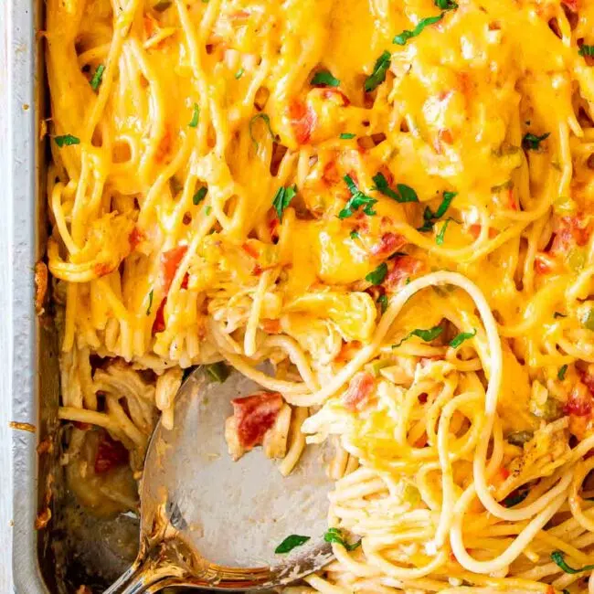 You can easily make this recipe ahead of time. All you have to do is just assemble the dish, cover it with plastic wrap, and then in the fridge. Then when you are ready, just put the chicken spaghetti casserole in the oven to bake and serve.